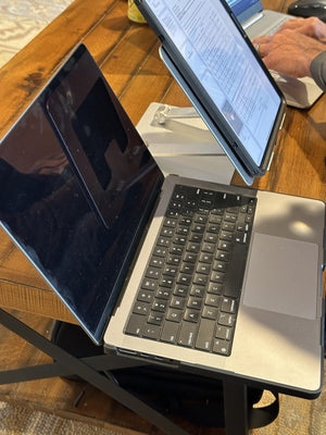 Da, suportul se pliază compact și ușor, fiind ideal de transportat în geanta de laptop pentru profesioniștii mereu în mișcare.